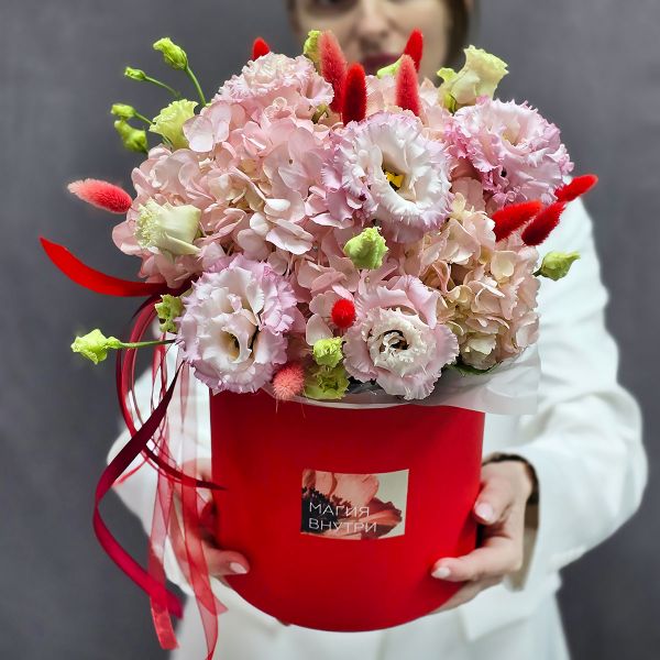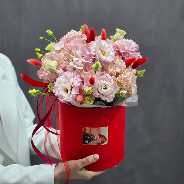 - Цветы гортензий и эустом в коробке Нежная страсть