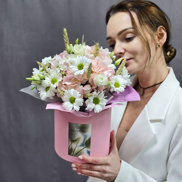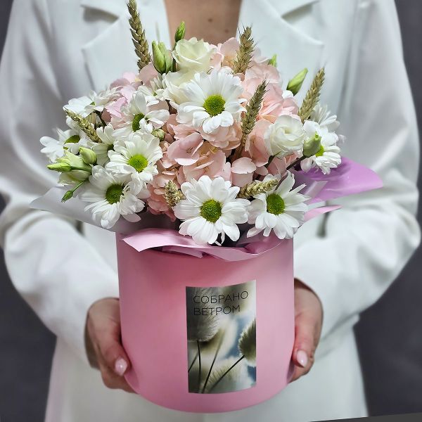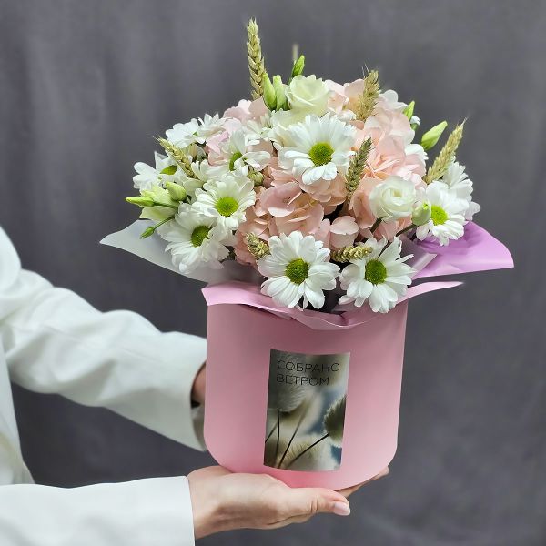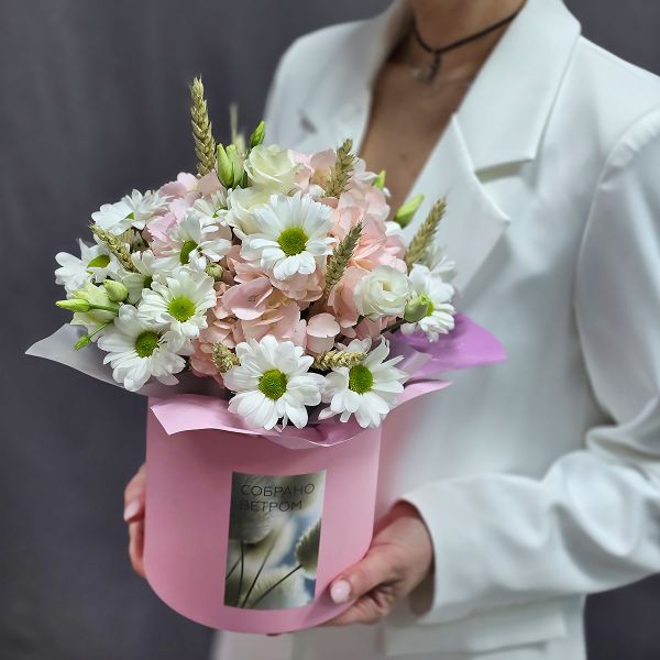 - Цветы в коробке с гортензией Розовое облако