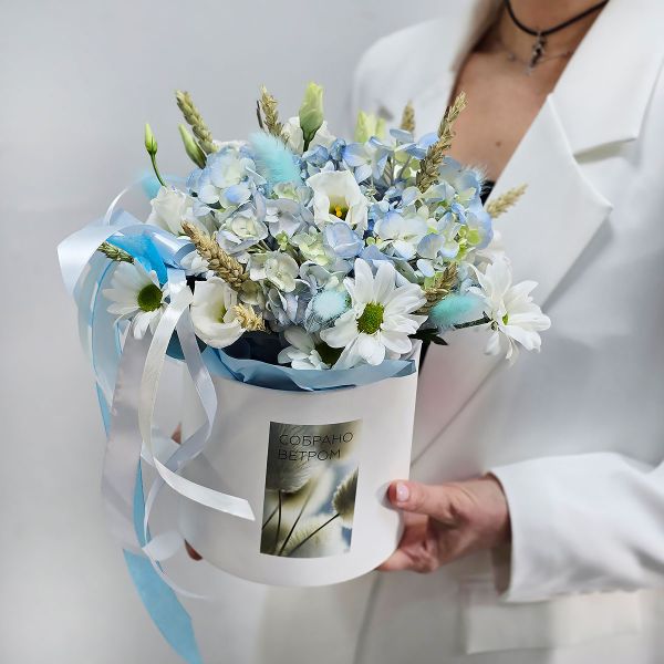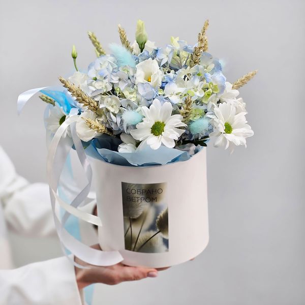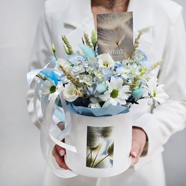 Белая шляпная коробка из кустовой хризантемы и пшеницы представляет собой элегантный и изысканный подарок ручной работы, созданный специально для тех, кто ценит природную красоту и качество исполнения. Продукт идеально подходит для любых торжественных мероприятий, будь то дни рождения, юбилеи, свадьбы или корпоративные мероприятия.
