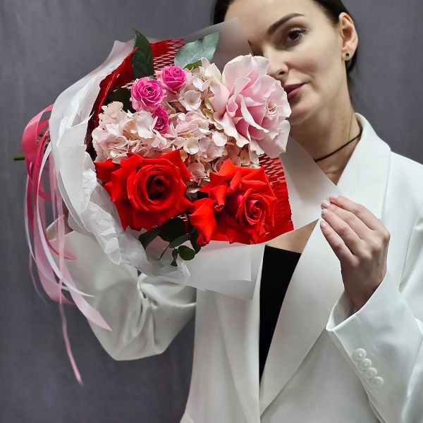- Французские алые и розовые розы Отблеск огня